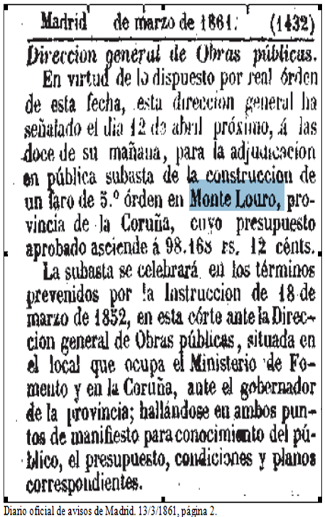 Aí o está, non o asemella, pero o faro de Monte Louro xa ten 152 anos de vida! Foi construido coa finalidade de embocar a ría de Muros librando dos baixos de Virullos e Ximiela. A súa, luz vindo de norte para sur, e …sempre co alto do cabo da Nave á vista por fora do cabo de Fisterra (para librar por fora de Meixide) non é visible até estar ao W verdadeiro do faro; que é cando se está libre polo S. dos devanditos