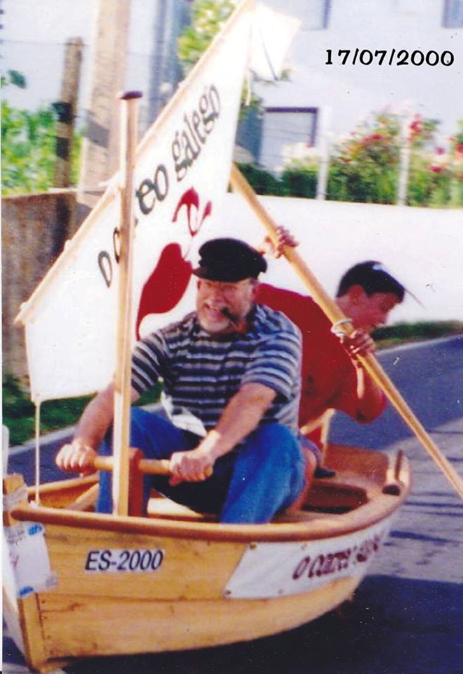 A.B.:_ Coñecín Pepe Agrelo, ou director de teatro, antes de coñecer a Don Xosé Agrelo, ou Mestre. Aínda viviamos en Bayona, e foi durante unhas vacacións que estabamos en Noia e vimos que había teatro no Concello. Noite de Lobos. Foi impresionante. Quen me ía dicir que coincidiría con Agrelo anos despois, mestres os dous, en Esteiro. Aquela función reavivou en min a afección do teatro, lembrei o Juan josé, de Joaquín Dicenta (avó do meu Mestre, Don Pedro), por algunha estraña asociación de ideas, volvin recapacitar sobre a importancia do teatro como revulsivo social e cultural e decidín levar o teatro aos meus alumnos como recurso de comprensión e de expresión persoal e colectivo. Pero con Agrelo en escea, nunca mellor dito, o mellor que podía facer eu era «silencio polo foro» antes mesmo de empezar. Agrelo era moito Agrelo. Con que vanidade podo dicir hoxe que fun eu quen escribiu no ordenador o texto completo dá súa «novela» (autobiografía novelada) «Os sete coitelos», para pasarllo á editorial, e, aínda máis, que fixo caso dá miña suxestión de que suprimise a última folla do orixinal… hoxe lamento que me fixera caso. J.L.:_ E aínda así, non te resistiches a buscar válvulas de escape que che permitisen achegar o teu “granito de arena”, o teu persoal toque no esceario dos festivais de Nadal, de Fin de Curso… Un fito para ti foi aquela representación que dirixiches dunha emotiva obriña que escribiu unha alumna túa: O escenario en dúas metades: a un lado, as mulleres «viúvas dos vivos» botando de menos en Nadal ós seus homes que, ao outro lado, botaban de menos tamén os seus fogares. Cartolinas azuis eran as ondas que axitaban o mar que os separaba. Se ata te atreviches, xordo como dis que es para a música, a dirixir a toda a túa clase convertida en coro e levala ao I CERTAME DE VILANCICOS, e aínda volverías ao ano seguinte.