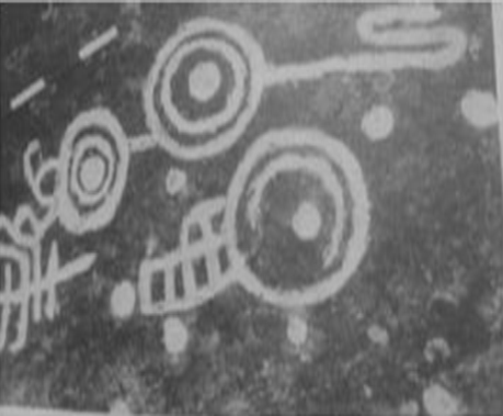 forman varios grupos de cazoletas y círculos. Uno de estos círculos tiene a sus lados terminaciones en cuadrados y otros en unas líneas que forman una especie de cuadricula, más semejante a una escalera. Otro grupo es el formado por dos círculos unidos entre sí por una recta y uno de los círculos remata en una línea serpentiforme.(fig.2).