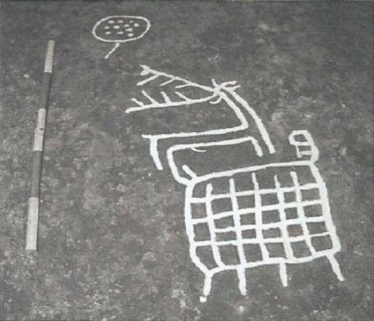 Esta enorme piedra está dividida en varias secciones. A simple vista se encontraba el más significativo de los grabados, un ciervo con cornamenta y sexo que está unido a un entramado de líneas que parece una trampa