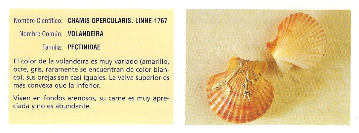 navallas, vieiras ostras, mexilóns, etc. Prescindindo da parte comestible… en Muros, temos a sorte de contar con varios coleccionistas de moluscos e bivalvos. Un deles, José Manuel Formoso Luces (Porrúa), ten clasificados arredor de dous mil exemplares. Unha parte deles foron mostrados en diferentes exposicions ao longo de toda Galicia, e incluso a Federación de Empresarios do Barbanza editou un libro no que se recollían os propios da nosa bisbarra.