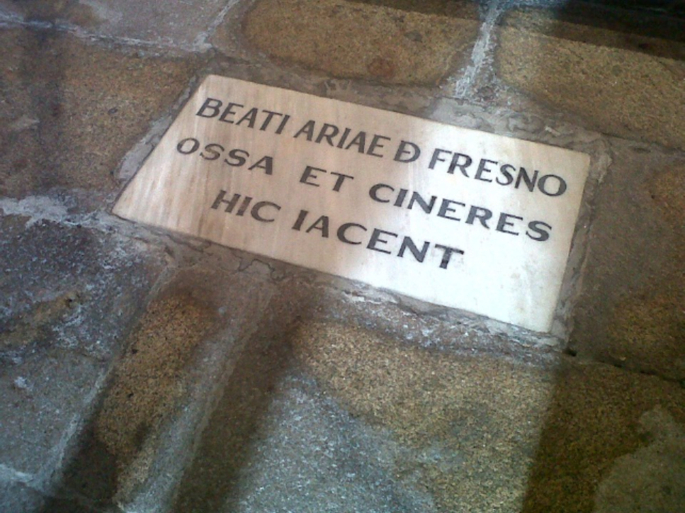 Alí en Louro, na igrexa do Convento dos Franciscanos, diante do altar maior, hai unha pequena lápida de mármore branco que ten gravada a seguinte incripción: “BEATI ARIAE DE FRESNO / OSSA ET CINERES / HIC IACENT (Aquí xacen osos e cinzas do Beato Arias de Fresno). Para moitos igual resulta descoñecida a historia deste Home de Deus, que foi soterrado na conventual de Louro, despois de ser declarado “Beato” (Benaventurado) pola Igrexa, anos despois do seu pasamento.