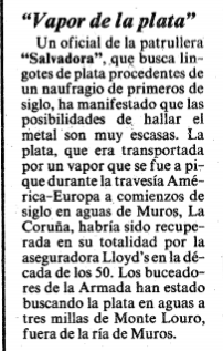 A curiosidade levoume a remexer nas hemerotecas e atopei esta reseña no periódico «La Vanguardia» que fala de como , outra vez máis, se espoliou por parte duns caza-tesouros un pecio que naufragou no ano 1891 nas nosas costas, O «Skyro» , o Vapor da prata.