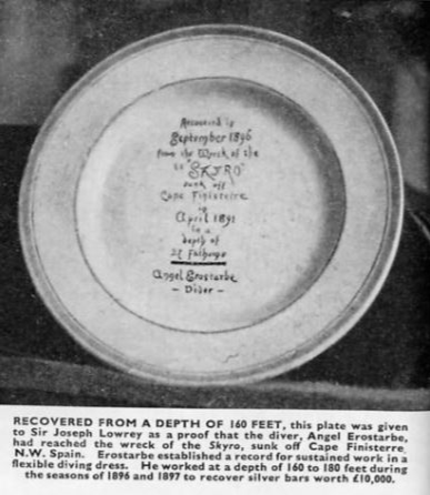 “The S.S. Skyro sank in deep water after striking a reef off Cape Finisterre in 1891 carrying a valuable cargo of silver bullion. Two salvage attempts failed due to the extreme depth and persistent bad weather, until in 1896, the Spanish diver, Erostarbe, using Siebe Gorman equipment, finally located the treasure at a depth of 20 fathoms. Erostarbe used dynamite to gain access to the cabin where the silver was stored. This was not easy, after five years on the sea bed the Skyro had broken up and the deck above the strong-room had collapsed to within 18″ of the cabin floor. On the surface boisterous weather and strong currents made tending the diver difficult. Nevertheless Erostarbe clawed a path to the bullion and during several long, deep, dives recovered 59 bars of silver”