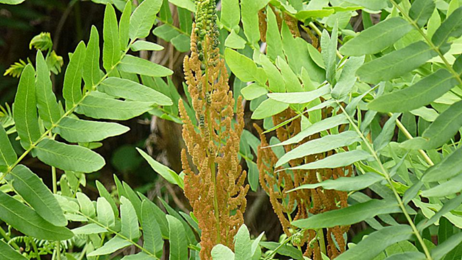 Este grande e magnífico fento ten os soros en elegantes “ramilletes”, que son ponlas marróns que sobresaen por riba das espléndidas enormes frondes e que se ven de Xuño a Novembro, logo “mustiánse” coma todas as outras “polas”.