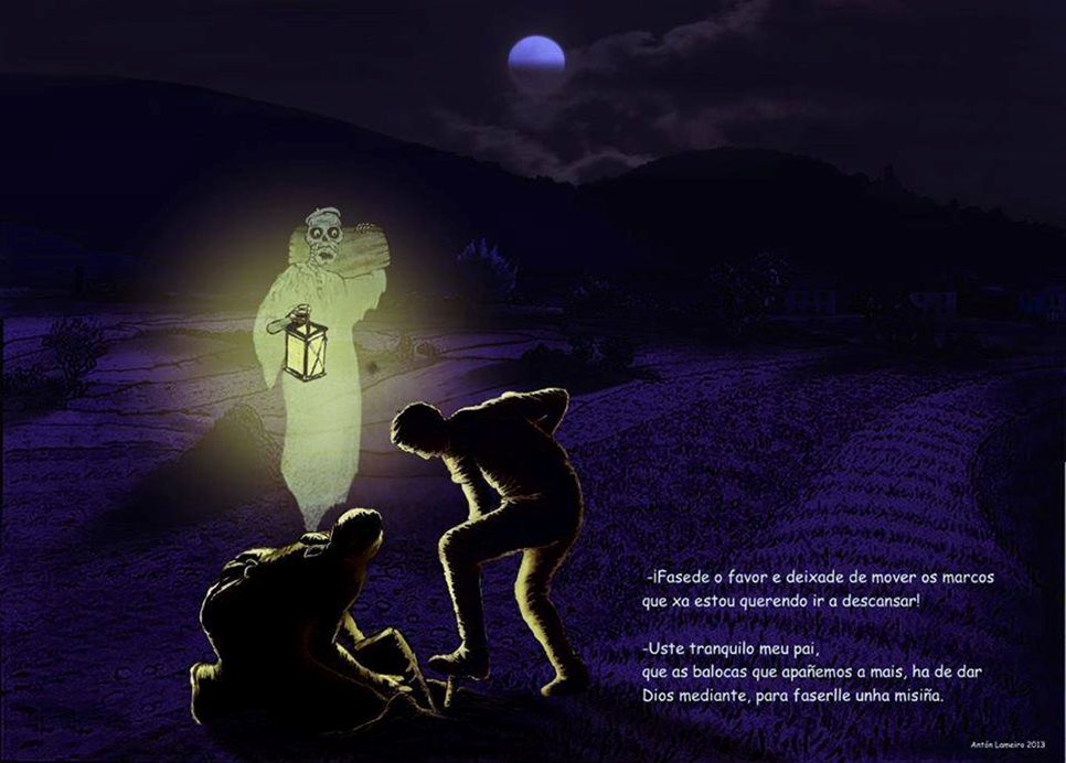 Contábame miña avoa Ramona que o que move o marco dunha leira, roubándolle ós veciños, queda en débeda sagrada; ou sexa que si morre sin volver ó marco o seu sitio, non pode entrar no ceo nin no inferno, ate que repoña o marco no seu lugar orixinal. Convértese entón nunha ánima en pena e aparécese polas noites, na maioría dos casos cargando o marco e un farol.