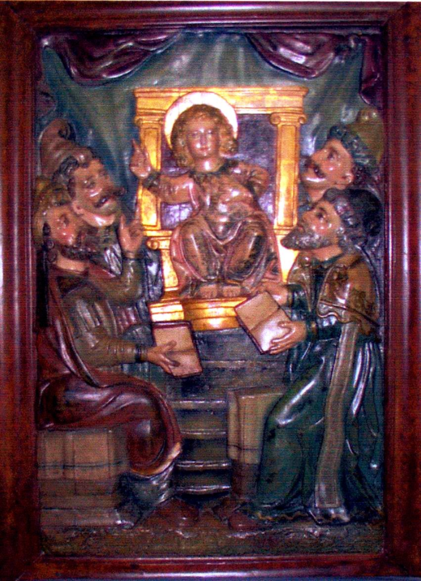No altar maior da parroquial de Muros, e rodeando a imaxe gótica de Santa María do Campo, hai un conxunto de catro releves con motivos da vida de Cristo. As catro pezas, presentan diferentes tamaños. As tres mais grandes miden 127×76 cm, mentres que a pequena 112×80 cm. As tallas representan catro esceas da vida de Cristo: A Adoración dos Pastores, A Adoración dos Magos, A Presentación no templo, e Cristo ante os Doutores. As tallas propiamente ditas están rodeadas por marcos de madeira iguais en grupos de dous, co mesmo tratamento pictórico de estarcido marrón. O estarcido non e unha práctica habitual para pintar marcos xa que e un procedemento de calco que consiste en debuxar unha figura que se quer reproducir en un papel groso, furando o seu contorno con furadiños finos moi cercanos entre si, e golpeando logo coa bolsiña que contén o pó-pintura, lógrase o efecto. Puxera que o autor pretendera lograr coa técnica do estarcido, que os marcos de madeira tivesen o que hoxe en día chamamos o efecto <martelé>.