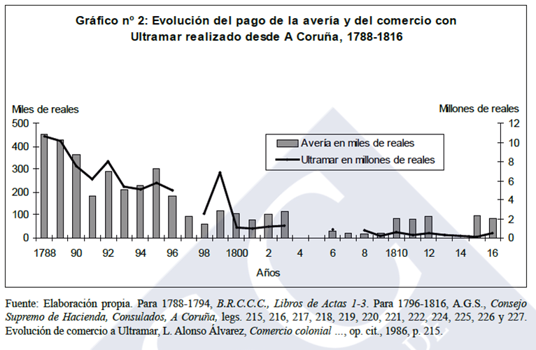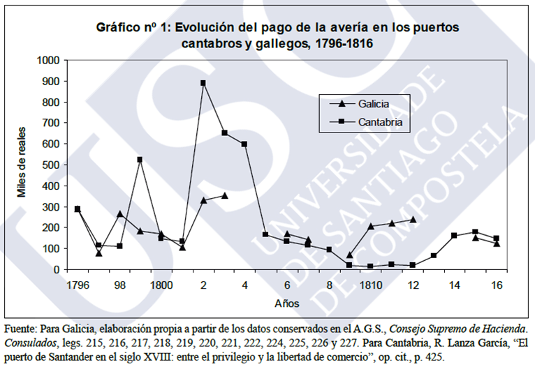 Es en este contexto donde cabe situar el estudio de la evolución del comercio gallego entre 1796 y 1816. Para ello, contamos con la ayuda de las series anuales de la avería confeccionadas a partir del pago del medio por ciento del total del valor de las mercancías que entraban o salían por los puertos de Galicia. Un impuesto que sin embargo se encontraba afectado por factores que se sitúan más allá de los aspectos estrictamente comerciales, caso de la inflación monetaria o de las naturales variaciones ocurridas en los precios de un mismo producto en razón de su calidad. Esto significa que a finales del siglo XVIII y comienzos del XIX su monto total pudo haber subido levemente respecto a épocas pasadas sin que la cantidad real de las mercancías con las que se traficaba hubiese variado de manera significativa. Asimismo, también se vio afectado por las urgencias recaudatorias que la Corona tuvo en determinados momentos, como por ejemplo con posterioridad a abril de 1793 y mayo de 1797, cuando la avería se duplicó con la intención de conseguir por esta vía más dinero para hacer frente al coste de las guerras mantenidas, respectivamente, con Francia e Inglaterra. Con todo, es este un problema que se ha planteado en todos los trabajos que han venido recurriendo a esta fuente, lo cual no ha impedido a sus autores hacer uso la avería en sus investigaciones. Aunque todos ellos han tenido la precaución, eso si, de uniformizar sus series y de querer ver en sus evoluciones la tendencia que en la media y larga duración ha seguido el comercio costero del puerto o área regional objeto de estudio.