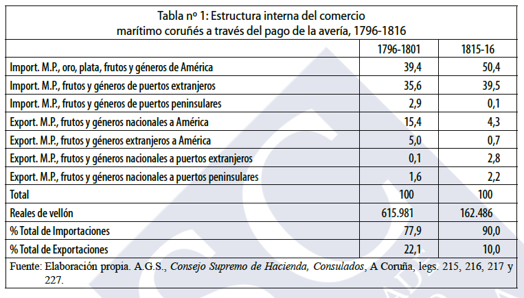 que entre 1796 y 1816 fueron responsables de la recaudación del 63.1% del total de la avería, frente al 28.6% de Vigo o al 8.3% de los restantes 35 puertos agregados al Real Consulado.