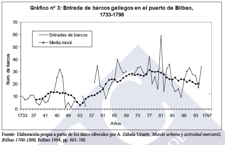 como el tráfico marítimo gallego con destino a Bilbao experimentó un rápido y primer impulso entre 1753 y 1764, coincidiendo con las obras de construcción del arsenal de Ferrol, y un segundo, escalonado de 1765 a 1777, coincidente a su vez en el tiempo con la duración del privilegio de A Coruña para comerciar con América en régimen de monopolio. El cuestionamiento del mismo a raíz de la entrada en vigor de los Decretos de Libre Comercio en 1778, supuso el lento e inexorable declive de un cabotaje compuesto en su mayor parte por pinazas y pataches.