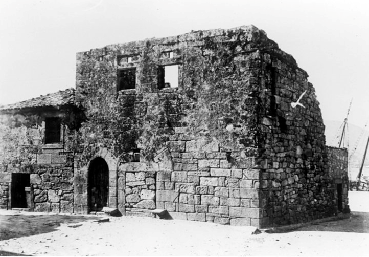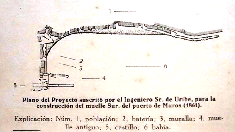 1805, muriendo en la refriega el comandante y quedando desde esta fecha una serie de lisiados en la Villa, al arrojarse sus defensores, desde los muros, para huir del ataque. La causa del desastre se atribuye al poco caso que los jefes hicieron de los avisos que,, acerca de las intenciones del enemigo, se le hicieron, además de la falta de auxilio que tuvieron los sitiados. Las fuerzas atacantes pertenecían a la escuadra del almirante Calder que, después del combate llamado de Finisterre, entre la escuadra franco-española y la inglesa, destacó unos buques que bombardearon a Muros, dejando señales en muchos edificios que aún pueden verse, y tomaron el castillo. Como recuerdo de este hecho, una casa de la Calle de la Marina de la Villa, conserva colgada de su fachada una bala de hierro de unos 20 k., con la siguiente inscripción: <<Regalo inglés. Julio 22 de 1805>>, hecho que se confirma plenamente con el acta municipal que dice así: <<En la Villa de Muros y Casa de su Ayuntamiento a 19 de Enero de 1806. Yo escribano requerido por parte D. Juan Antonio de Artaza Olaquibel, habiendo noticiado este Real Despacho a su merced el Juez de esta Villa D. Juan Antonio Sánchez Porrúa, teniéndolo en mi presencia, se lo hice saber y notifiqué, para que bajo la multa de doscientos ducados de irremisible exacción, haga guardar y cumplir el Real Despacho ejecutorio, librado por or queden del Rey Carlos IV, a favor de D. Juan A. de Artaza poniéndole en posesión de su vizcainia y nobleza, guardándole las preeminencias y prerrogativas que le corresponden como tal noble…>> etc. Agregando luego: <Obedece como debe, el Real Despacho que se le hace saber, y mediante a que con motivo de haber entrado en esta ría una fragata inglesa haciendo varios insultos (cañoneando) fue preciso quitar de este Ayuntamiento el archivo de papeles y privilegios y libros correspondientes a el para fuera de la Villa, a distancia de cerca de una legua, luego que se recoja se colocará el referido Señor en los libros que corresponden a su estado de nobleza…>>, etc. Queda, pues confirmado el hecho aludido.Dicha fortaleza fue luego convertida en la Cárcel del partido. Hoy, después de sufrir una completa transformación, en su parte más esencial, al ser casi destruido para levantar la Lonja Municipal, quedó el resto destinado a cárcel, perdiendo por esta causa su típico valor histórico, desapareciendo su aspecto de fortaleza. Parece ser que su construcción fue debida a los muradanos y luego cedida al Estado. Tuvo siempre tropa de línea con un oficial al frente, que en 1646, lo era D. Antonio García, sargento mayor de la plaza y a principios del siglo XVII D. Blas Cidrás y San Martín, teniente de caballería. Tenía también un guarda-almacén que, en años anteriores al 1778, era D. Antonio Paadín, cirujano.