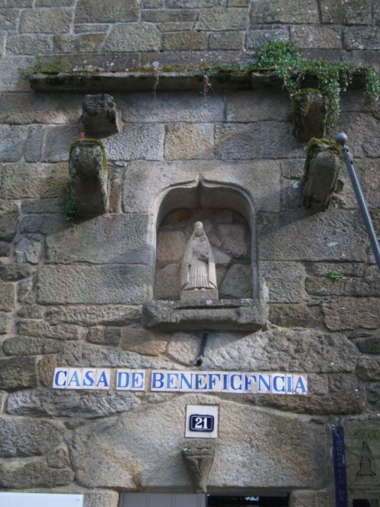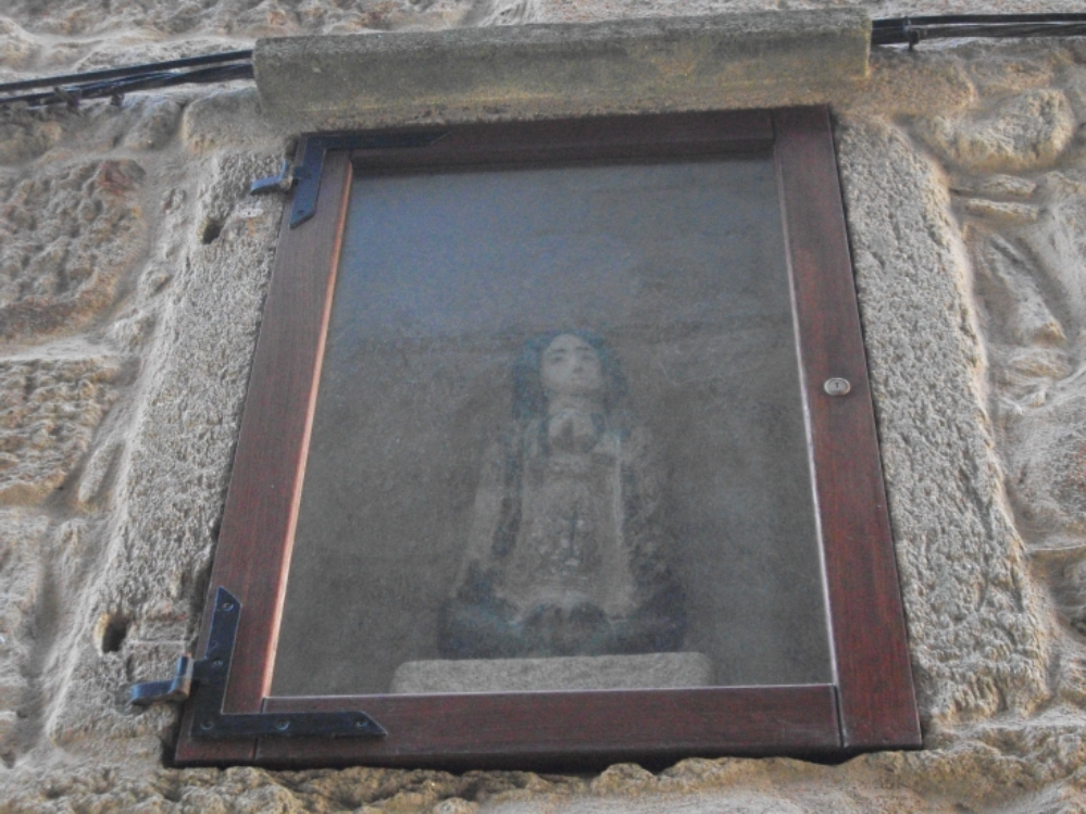 de murallas, existía una Hornacina colocada sobre el arco de la muralla que formaba la entrada de la llamada Porta d’a Vila, que situada en el espacio que hay entre la Casa Ayuntamiento y la de Don Manuel Fabeiro, Camino Nuevo o de la Iglesia, unida esta casa actualmente aun a un trozo de la antiquísima muralla que rodeaba la Villa y una de cuyas puertas, la del soportal de entrada a la casa citada, es abovedada y atraviesa la muralla. La imagen que allí estaba era la de la Virgen de los Dolores, tallada en piedra de gran espesor, de unos cuarenta centímetros de ancho en su frente, por ochenta de altura. Tiene colgado de la cintura un rosario tallado. Está cubierta con un manto y su posición es de pie. Esta imagen se conserva en la casa de D. Ramón Fabeiro, cuya familia la recogió al deshacerse el lienzo de muralla
