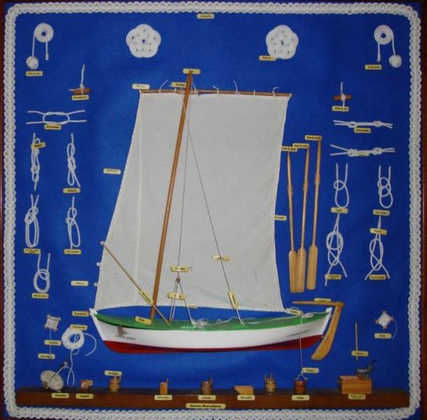 Si empezamos pola parte de arriba e pola esquerda, temos o”horcaperros”, expresandome da misma forma que nos lle chamabámos, este usabase para amarrar a ustaja a berga. O seguinte, e o nudo de “embergue,” que se usaba para amarrar a vela a verga. O seguintes, son as “margaritas”, usabanse para reparar momentáneamente unha falta nun cabo ou nunha liña. O seguintes son os”lasdeguias”, o doble usabase para amarrar un cabo por seno, e o outro para amarralo polo chicote. O seguimte e o no de “rezon”, que se usaba para amarrar un chicote a argola do rezon ou a outra anilla calquera.