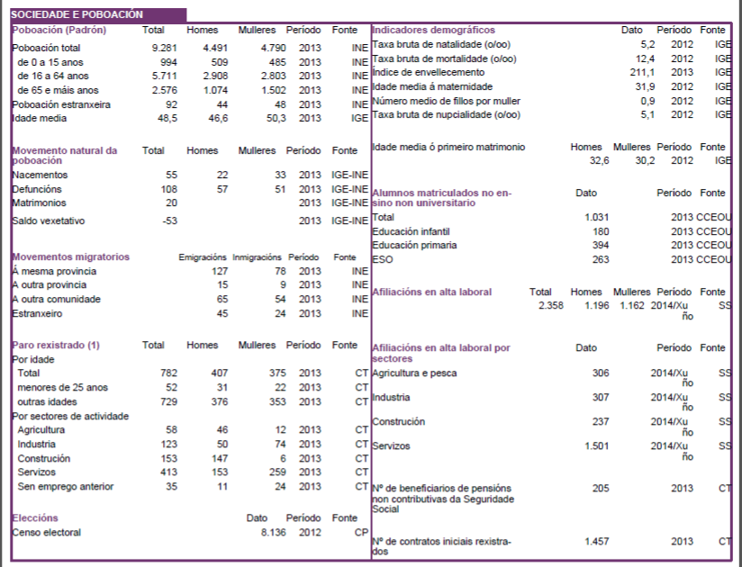 Os cadros que se acompañan proveñen de datos publicados polo Instituto Galego de Estatística e refrexan a situación estatistica do Concello de Muros, no referente a sociedade, poboación i economía, e se refiren aos anos 2012 e 2013 e parte de 2014.