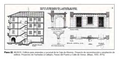 . No seu obxetivo básico o arquitecto resumía a obra a realizar nunha actuación sobre un edificio do século XVIII situado no Paseo do Porto de Muros, propiedade da Caixa de Aforros de Santiago de Compostela, de dúas plantas e tres fachadas, e medianera ao fondo: reconstrución e ampliación para sucursal bancaria e vivendas”.