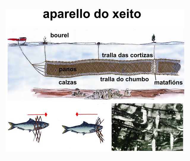 O xeito é a forma mais selectiva de pescar a sardiña, (Sempre baixo o meu humilde entender), e consta de unha longa rede, de forma rectangular, denominada como arte de deriva. Consta de tralla de corcho, tralla de plomo, é unha unica rede de enmalle, (quero suliñar “unica rede”, para xustificar a miña tese de rede selectiva). A luz de malla oscila entre uns 25 e uns 40 milímetros, è dependendo de si o peixe e mais ou menos grande, así se usa a malla. Estas redes despois de armadas, non deberían ter mais de 15 metros de altura, e de largo cada peza uns 90 ou 100 metros, (digo cada peza, por que unha “cacea” así é denominado o conxunto de pezas que unha embarcación pode levar), sempre dependendo da capacidade da mesma. (Antes cando todo era libre seguramente levaban as que querían, pero agora non creo que lles permitan levar mais de 10 pezas).