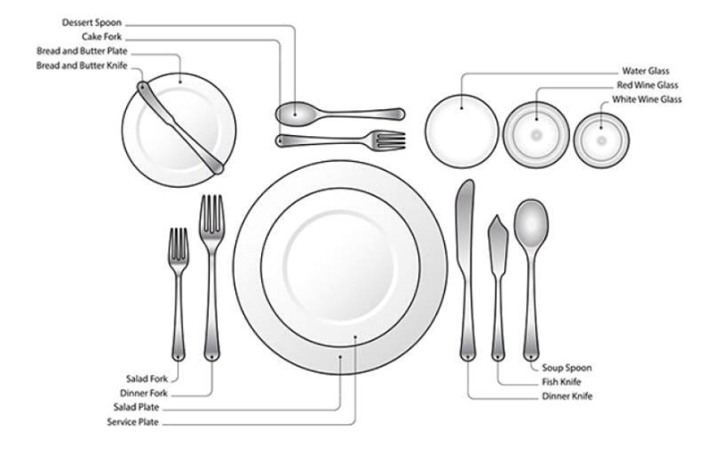 Posta así a mesa, o tamén importante é que as viandas gusten aos invitados, e que o servizo dos pratos se faga en orden (nada de servir a ensalada de postre). Para saber si un comensal rematou o prato, fixo unha pausa, ou non lle gustou hai unha linguaxe co uso dos cubertos. Así, si un comensal pon pon os cubertos que está usando en forma de triángulo