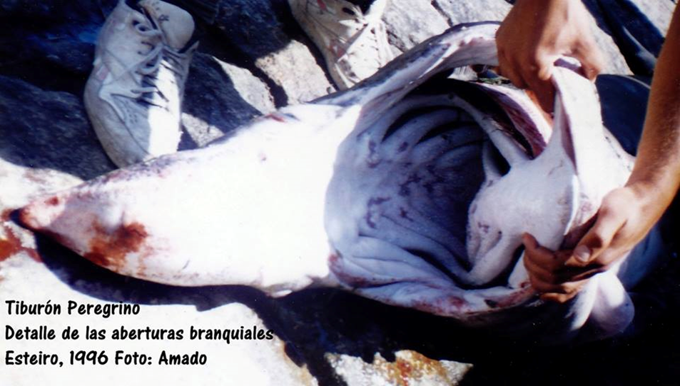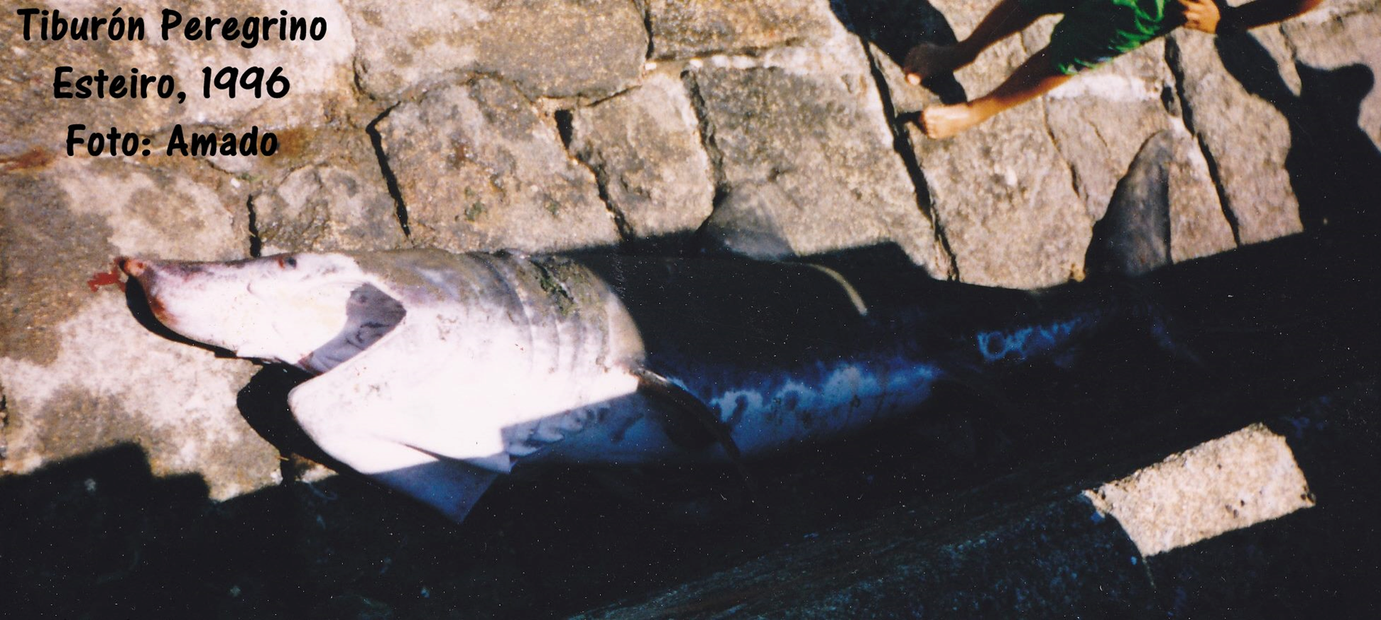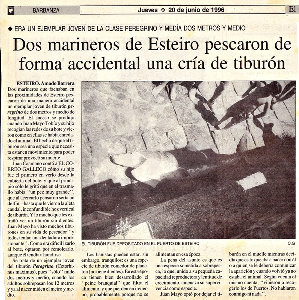 Adjuntamos recorte de prensa de EL CORREO GALLEGO en que se informaba de la captura accidental de un ejemplar joven. Ni antes ni después hemos tenido noticia de otro peregrino tiburón en la ría, todo hay que decirlo.