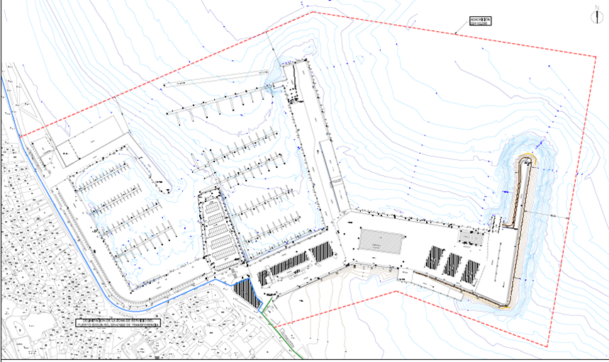 El muelle pesquero continúa a lo largo de 186m, con un calado variable entre 5m y 7m, hasta las instalaciones del Travel Lift, anexo al dique de abrigo de 115m de longitud.
