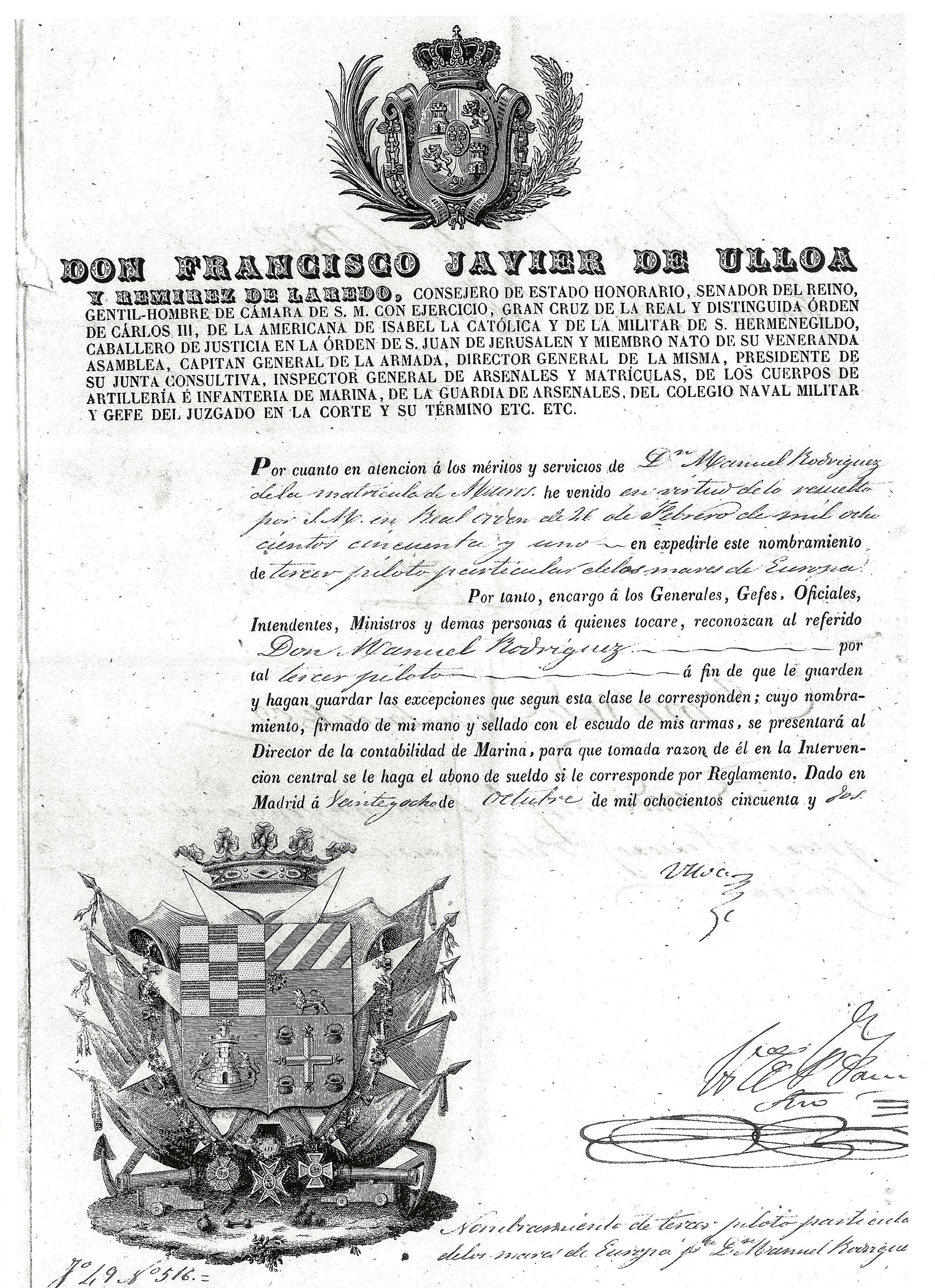 Copia de un documento do ano 1852, polo que se nomea ao veciño de Muros D. MANUEL RODRIGUEZ, TERCER PILOTO PARTICULAR DE LOS MARES DE EUROPA. Un detalle do documento son os títulos que ostenta o emisor do citado, Don Francisco Javier de Ulloa y Remirez de Laredo, que son abundantes e do máis variado.
