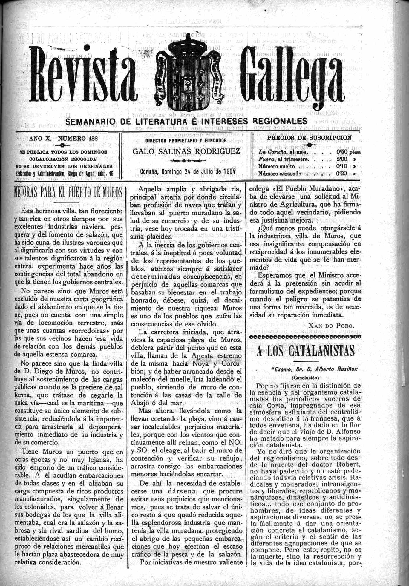 blos, atentos siempre a satisfacer determinadas concupiscencias, en perjuicio de aquellas comarcas que basaban su bienestar en el trabajo honrado, débese, quizá, el decaimiento de nuestra riqueza: Muros es uno de los pueblos que sufre las consecuencias de ese olvido.