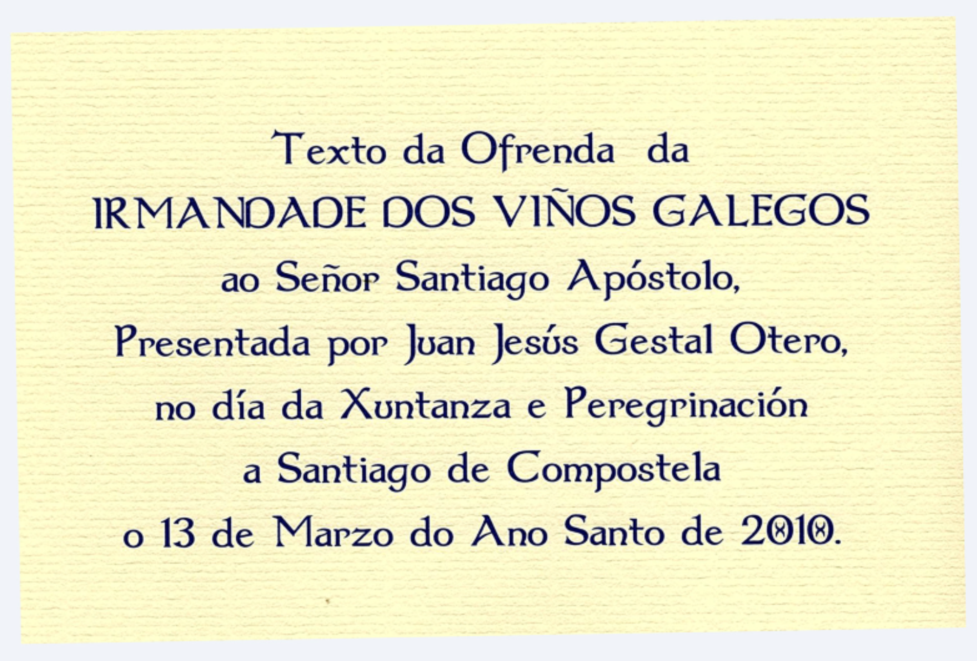Texto da Ofrenda da IRMANDADE DOS VIÑOS GALEGOS ao Señor Santiago Apóstolo, Presentada por Juan Jesús Gestal Otero, no día da Xuntanza e Peregrinación a Santiago de Compostela o 13 de Marzo do Ano Santo de 2010.